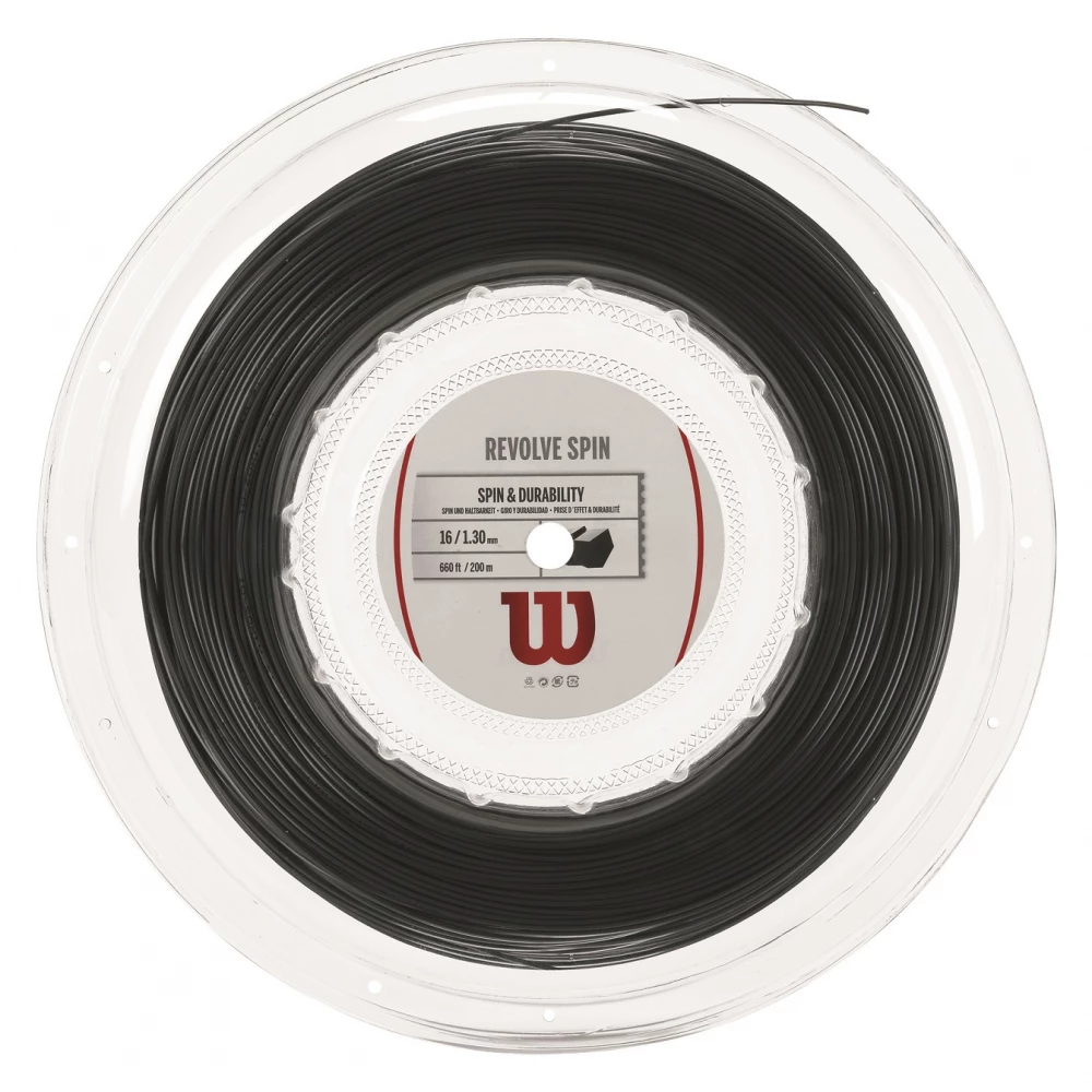 Wilson Revolve Spin Tennis String is comprised of Crosslink Ester Polymer and UHMW. Now featuring an edged shape, Revolve Spin offers exceptional spin while maintaining comfort and power.