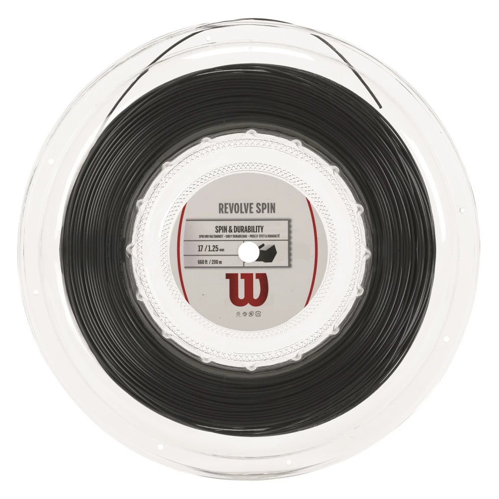 Wilson Revolve Spin Tennis String is comprised of Crosslink Ester Polymer and UHMW. Now featuring an edged shape, Revolve Spin offers exceptional spin while maintaining comfort and power.